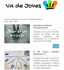 View Larger Image Butlletí Va de Joves del mes de gener Tornem a ser-hi! Ja pots consultar el butlletí del mes de gener! 👉 Butlletí Gener 2019 MontsiaJove 2019-02-01T14:36:12+00:00 01/02/2019| Comparteix Aquest Article FacebookTwitterLinkedinRedditTumblrGoogle+PinterestVkEmail