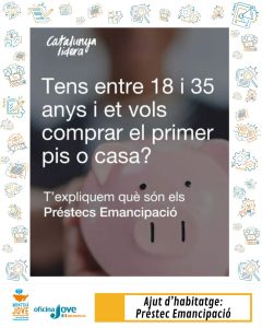 Finança l’entrada del teu primer habitatge al 0%. Si tens entre 18 i 35 anys i vols comprar el teu primer habitatge, el préstec ICF Habitatge Emancipació et permet finançar l’entrada fins al 20% de l’import de compravenda amb un límit de 50.000€.