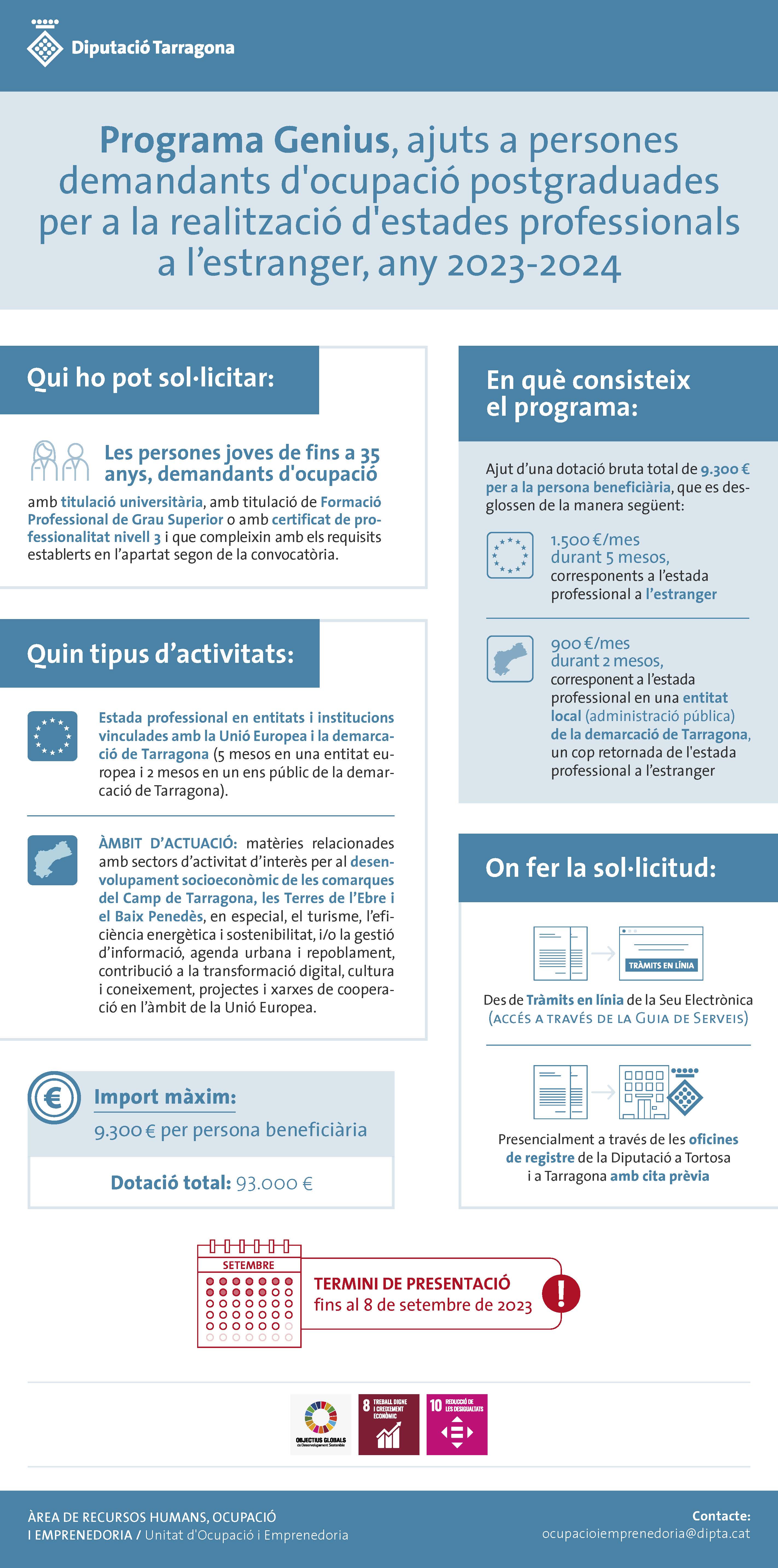 Aquests ajuts busquen potenciar, a través d’estades professionals a l’estranger, la formació i la inserció laboral de persones desocupades amb titulació universitària o Formació Professional de Grau Superior en matèries relacionades amb el turisme, l’eficiència energètica i sostenibilitat, i la gestió dels assumptes europeus d’interès per a la demarcació de Tarragona.