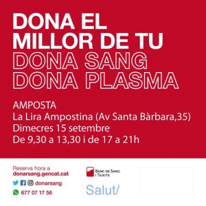 Vine a donar sang i plasma a Amposta el proper dimecres 15 de setembre de 9.30h a 13.30 i de 17 a 21h a la Lira Ampostina.