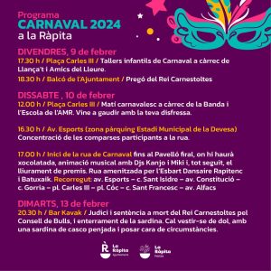 Carnaval 2024 Calendar Afegir a Calendari Afegir al calendari Timely Afegir a Google Afegir a Outlook Afegir a Apple Calendar Afegir a un altre calendari Export to XML Quan: febrer 9, 2024 @ 5:30 pm – febrer 13, 2024 @ 8:30 pm 2024-02-09T17:30:00+01:00 2024-02-13T20:30:00+01:00 On: La Ràpita Preu: Gratuït Festes Lleure Oci Ja pots consultar totes les activitats programades al Carnaval de la Ràpita aquí. MontsiaJove 2024-02-02T13:28:57+00:00 02/02/2024| Comparteix Aquest Article FacebookTwitterLinkedinRedditTumblrGoogle+PinterestVkEmail