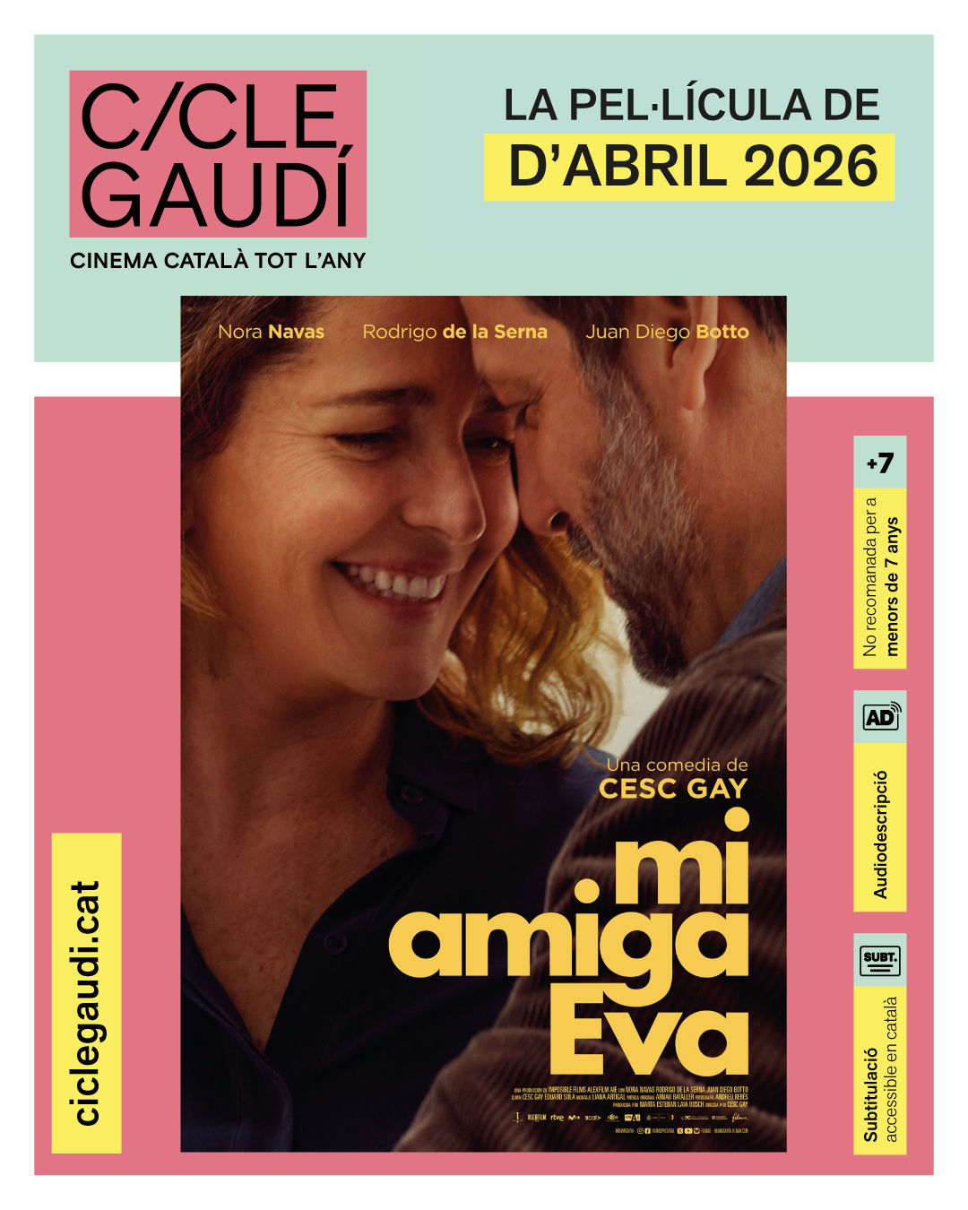 Emmarcada dins el Cicle Gaudí el diumenge 12 d’abril 2026 a les 18.00 al Centre Obrer de la Sénia es projectarà la pel·lícula Mi amiga Eva de Cesc Gay.