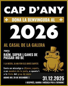 Festa de CAP d’ANY Calendar Afegir a Calendari Afegir al calendari Timely Afegir a Google Afegir a Outlook Afegir a Apple Calendar Afegir a un altre calendari Export to XML Quan: desembre 31, 2025 @ 9:00 pm – gener 1, 2026 @ 5:00 am 2025-12-31T21:00:00+01:00 2026-01-01T05:00:00+01:00 On: La Galera Preu: Gratuït Festes Lleure Oci Acomiada l’any 2025 i vine a rebre el nou any 2026, amb la festa de Cap d’Any que ha organitzat l’associació Joves Sapets de la Galera. Gaudeix de música i festa fins la matinada! Tota la info. aquí MontsiaJove 2025-12-23T13:12:44+00:00 23/12/2025| Comparteix Aquest Article FacebookTwitterLinkedinRedditTumblrGoogle+PinterestVkEmail