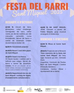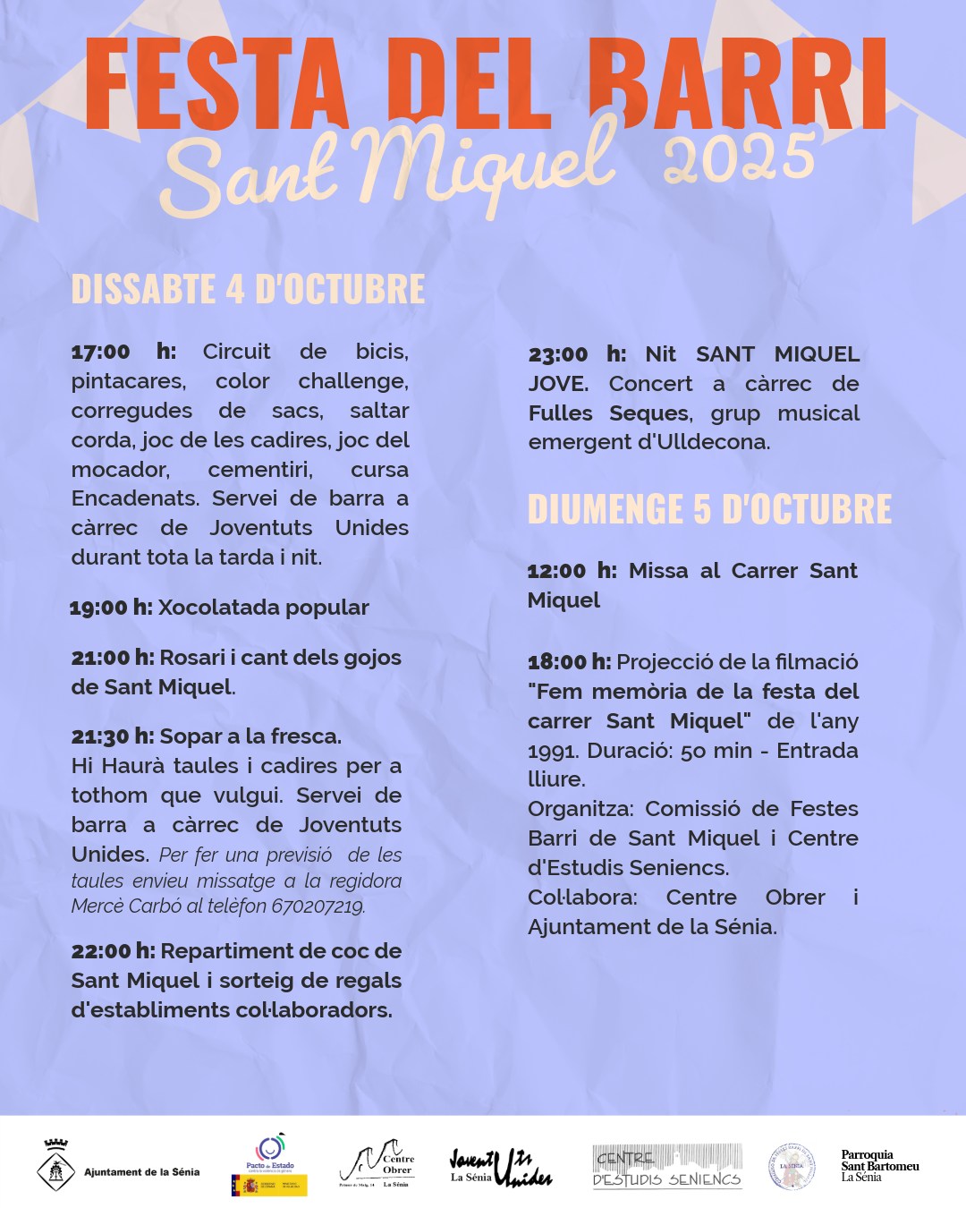 Vine a celebrar la tradicional festa del barri Sant Miquel de la Sénia! Comença octubre gaudint de les activitats que s’han programat per als dies 4 i 5. No hi faltis!