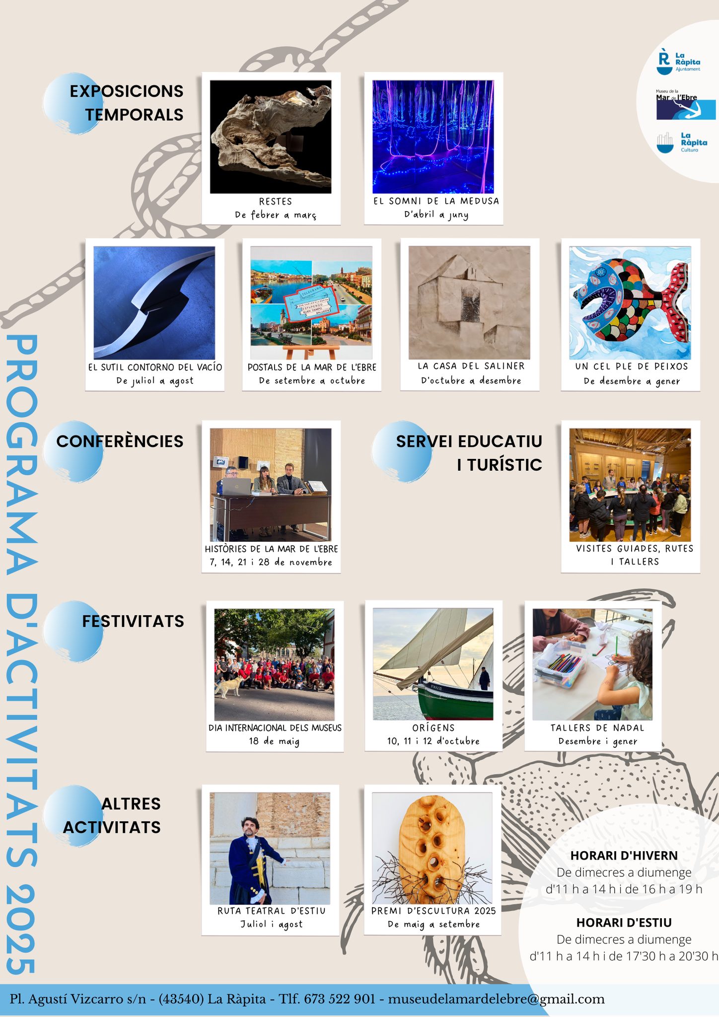 El Museu de la Mar de l’Ebre presenta una interessant i engrescadora programació cultural per enguany, que inclou exposicions d’art, fotografia, instal·lacions, el cicle de conferències ‘Històries de la Mar de l’Ebre’, activitats festives i visites teatrals.