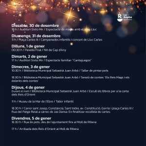 Nadal 2023/ 2024 a la Ràpita. Calendar Afegir a Calendari Afegir al calendari Timely Afegir a Google Afegir a Outlook Afegir a Apple Calendar Afegir a un altre calendari Export to XML Quan: desembre 21, 2023 @ 11:30 am – gener 5, 2024 @ 5:00 pm 2023-12-21T11:30:00+01:00 2024-01-05T17:00:00+01:00 On: La Ràpita Cultura Festes Lleure Oci Consulta la programació d’actes que s’han organitza a la Ràpita aquest Nadal 2023/ 2024. Trobaràs un assortiment molt variat d’activitats, destinades a diferents edats, gaudiu de les que més us agradin! MontsiaJove 2023-12-27T15:00:00+00:00 27/12/2023| Comparteix Aquest Article FacebookTwitterLinkedinRedditTumblrGoogle+PinterestVkEmail