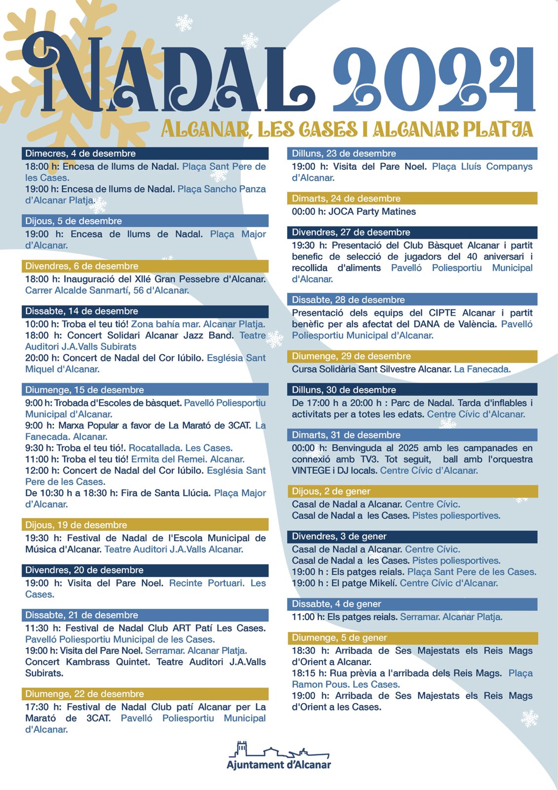 Aquí teniu l’extensa programació d’activitats i actes nadalencs que ha preparat l’Ajuntament d’Alcanar per gaudir d’aquestes dates tan senyalades i màgiques.