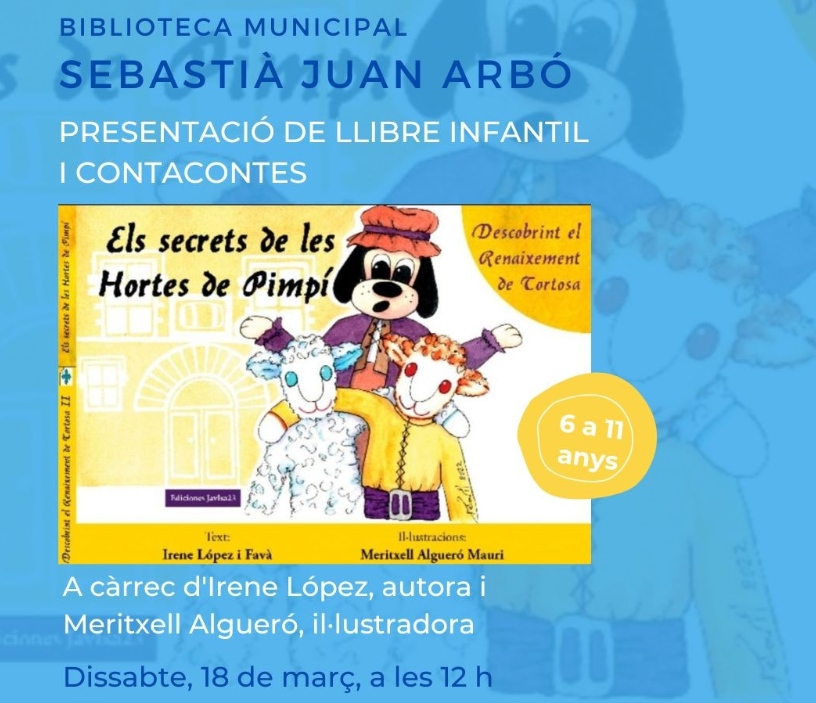 Es presentarà el llibre infantil dels Secrets de les Hortes de Pimpí a càrrec d’Irene López, autora, i Meritxell Algueró, il·lustradora. A posteriori s’efectuarà un contacontes. Aquesta