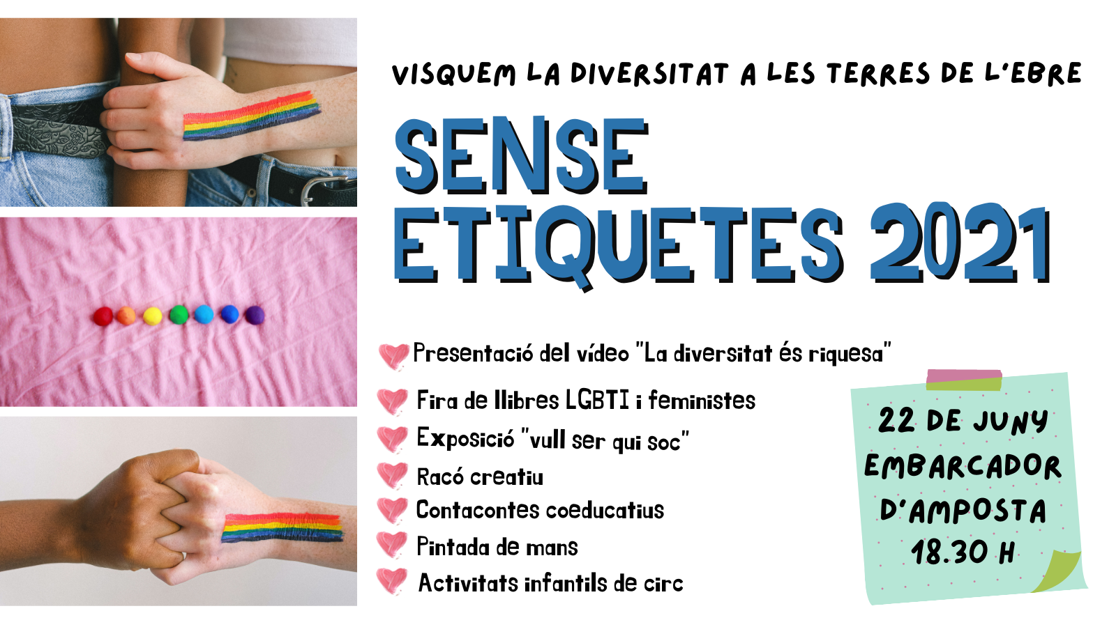 Els SAI (Servei d’Atenció Integral) d’Amposta, Tortosa, dels consells comarcals de les Terres de l’Ebre juntament amb l’associació Les Arremblades i l’Àrea per la Igualtat de Tracte i no Discriminació LGBTI del Departament d’Igualtat i Feminismes de la Generalitat de Catalunya han organitzat una jornada lúdica educativa. Començarà a les 18.30 h amb conta contes educatius que explicarà alumnat del curs formatiu d’Educació Infantil de l’Institut Montsià. A més, hi haurà una fira de llibres de temàtica LGTBI i feminismes.