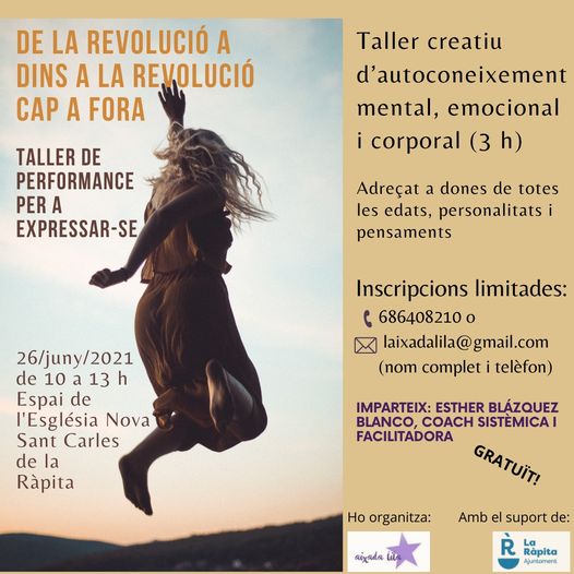 La Regidoria de Polítiques Socials i d’Igualtat de La Ràpita, dona suport i col·labora en l’organització del taller per a dones: DE LA REVOLUCIÓ A DINS A LA REVOLUCIÓ CAP A FORA.Serà un taller creatiu d’autoconeixement mental, emocional i corporal. Crearem un espai segur on la connexió i la presència siguin la base del procés creatiu.