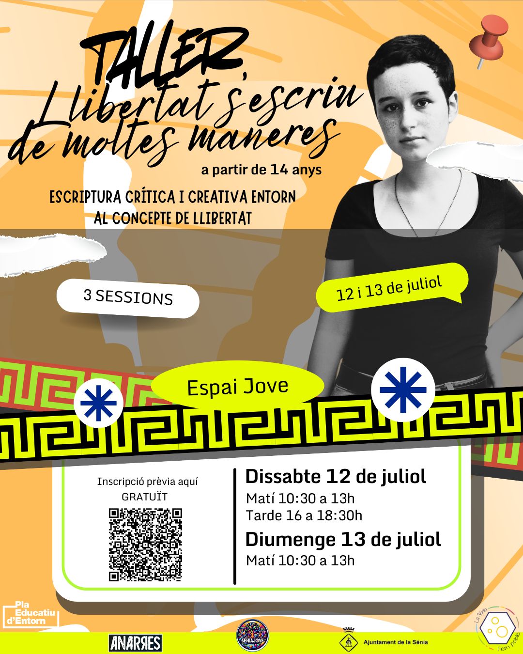 El 12 i 13 de juliol, a l’Espai Jove de la Sénia es realitzarà un interessant taller: “Llibertat s’escriu de moltes maneres“, consistent en realitzar escriptura crítica i creativa entorn al concepte de llibertat. El taller és per a joves de a partir de 14 anys i són tres sessions gratuïtes. Vine a experimentar, no t’ho perdis!!