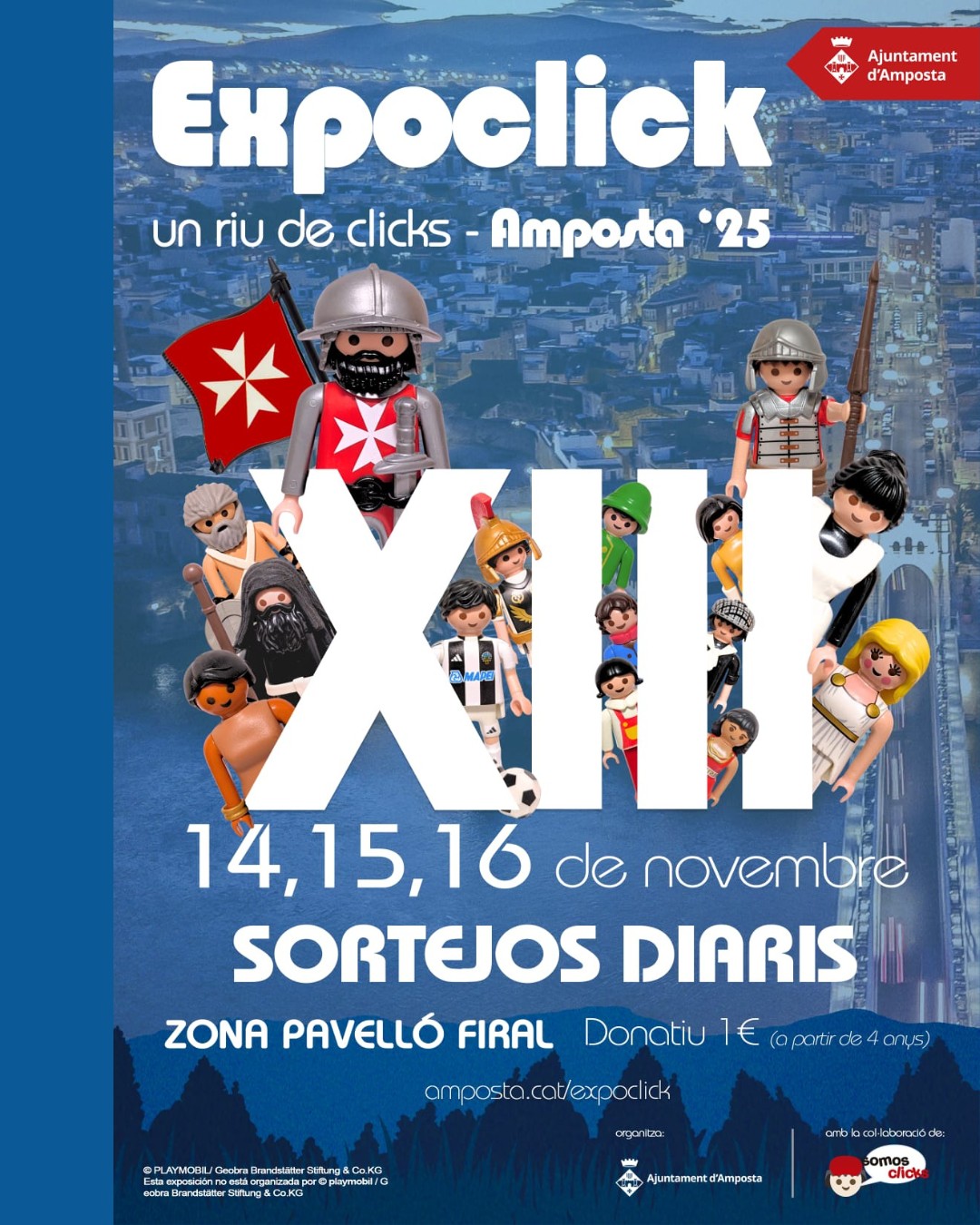 Amposta torna a omplir-se de cliks! Aquest cap de setmana, la ciutat viurà la 13a edició d’Expoclick, la fira dedicada als amants dels Playmobil. L’entrada tindrà un preu d’1 euro (a partir de 4 anys) i, guardant l’exemplar, donarà dret a participar en sortejos diaris de tres lots de productes Playmobil, valorats conjuntament en més de 600 euros.